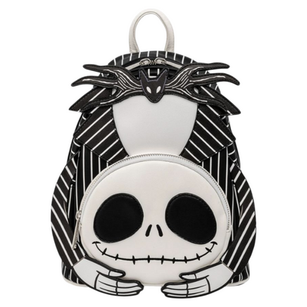 The faux leather backpack features Jack Skellington’s iconic pinstripe suit, complete with his bat bowtie, while his detachable skull-shaped front pocket creates a headless effect that’s both creepy and cool! Jack’s bony hands wrap around the front, adding an extra layer of eerie detail that true fans will love.
