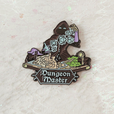 Command the table in style with this Dungeon Master Enamel Pin! Featuring a cloaked figure conjuring floating dice over an epic campaign map, this pin is a tribute to the true hero behind every adventure: the DM. Whether you're weaving stories or rolling nat 1s, this pin says you're the one pulling the strings.