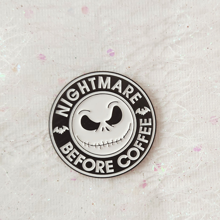 Start your day with spooky vibes and a strong cup of caffeine. This bold enamel pin features a mischievous Jack Skeleton surrounded by the phrase “Nightmare Before Coffee”—perfect for those who aren’t quite human until their first sip.