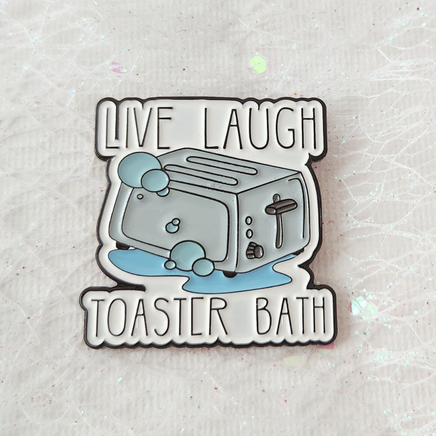 Dark humor meets pastel aesthetics in this bold and cheeky Live Laugh Toaster Bath Enamel Pin. Featuring a cartoon toaster mid-bath with bubbly accents, it’s a sarcastic twist on the classic “Live Laugh Love” mantra. Equal parts cute and unhinged, it’s made for the emotionally exhausted with a sense of humor.