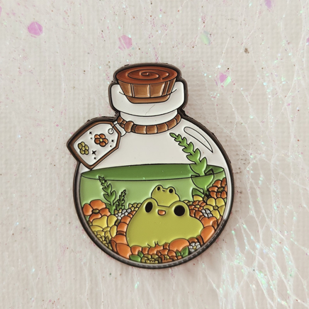 Escape into a tiny world of calm with the Frog Terrarium Enamel Pin. This charming pin features a chubby green frog and its little companion nestled in a bottle-shaped terrarium filled with vibrant plants, cozy pebbles, and a peaceful green “water” layer. Complete with a cork lid and tag detail, it’s perfect for lovers of frogs, nature, and all things whimsical.