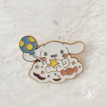 Float into sweetness with this Cinnamoroll Cloud Balloon Enamel Pin! Featuring Cinnamoroll cuddled up on a fluffy cloud surrounded by candy, stars, and holding a spotted balloon, this dreamy pastel pin brings cozy skies and kawaii joy to any collection.
