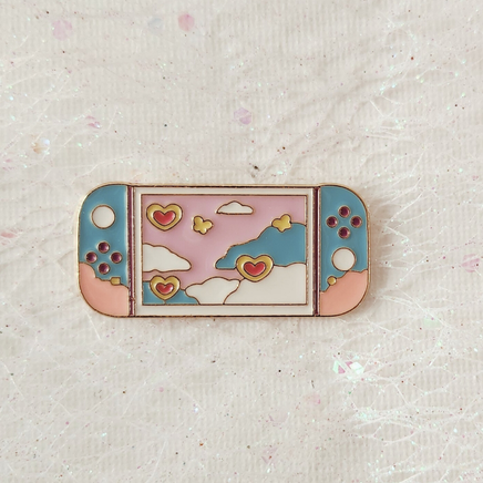 Escape to a dreamy pixel paradise with this Pastel Gaming Console Enamel Pin! Designed like a handheld console, this kawaii-inspired pin features a soft pink and blue cloudscape dotted with floating hearts, butterflies, and cozy vibes. It’s the perfect accessory for gamers who love cute aesthetics.