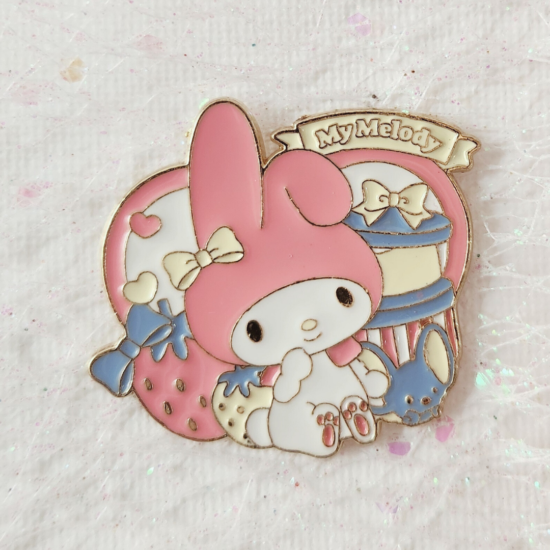 Sugary sweet and full of charm, this My Melody Dessert Enamel Pin is a pastel dream! Featuring My Melody surrounded by adorable sweets, bows, and gift boxes, this pin captures her gentle spirit in the cutest way. With soft pinks, blues, and gold details, it’s the perfect treat for any Sanrio collector.