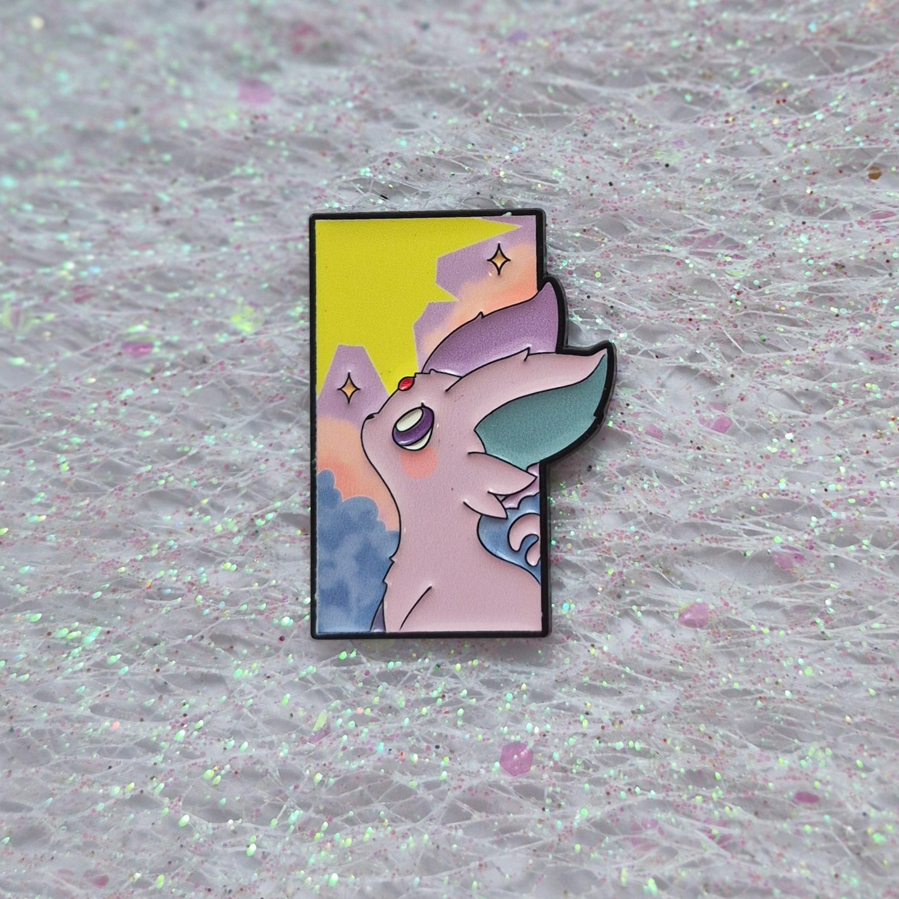 Elegant and serene, this enamel alloy pin is inspired by Pokémon’s Espeon and features a dreamy skylight-style illustration with soft clouds, glowing stars, and pastel tones. The tall, stained-glass inspired design captures Espeon’s calm and mystical presence, making it a beautiful accent for pin boards, bags, jackets, or collections.