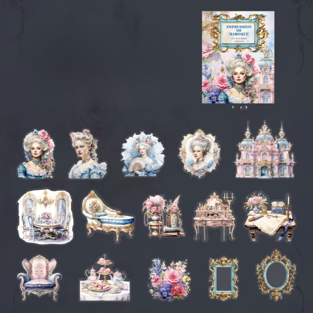 Step into a world of elegance and grandeur with the Impression of Baroque Sticker Collection. Each set features 15 intricate PET sticker designs, inspired by the opulence and artistry of the Baroque era. From regal portraits to ornate floral motifs, these stickers bring timeless sophistication to your creative projects.