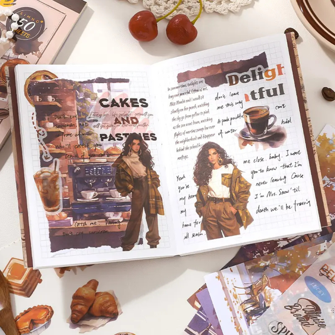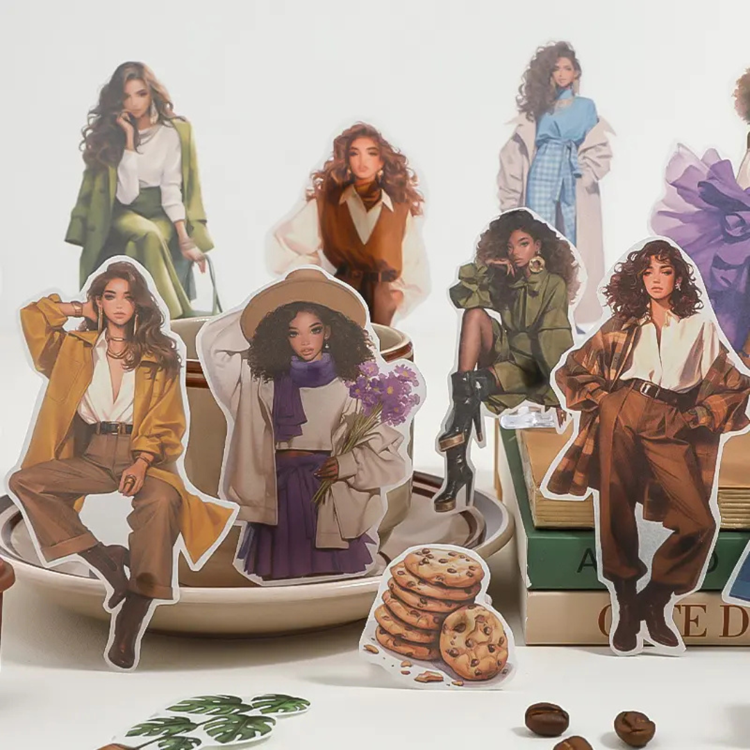 - 30 sticker sheets featuring stylish characters, coffee cups, desserts, travel scenes, and cozy vibes.