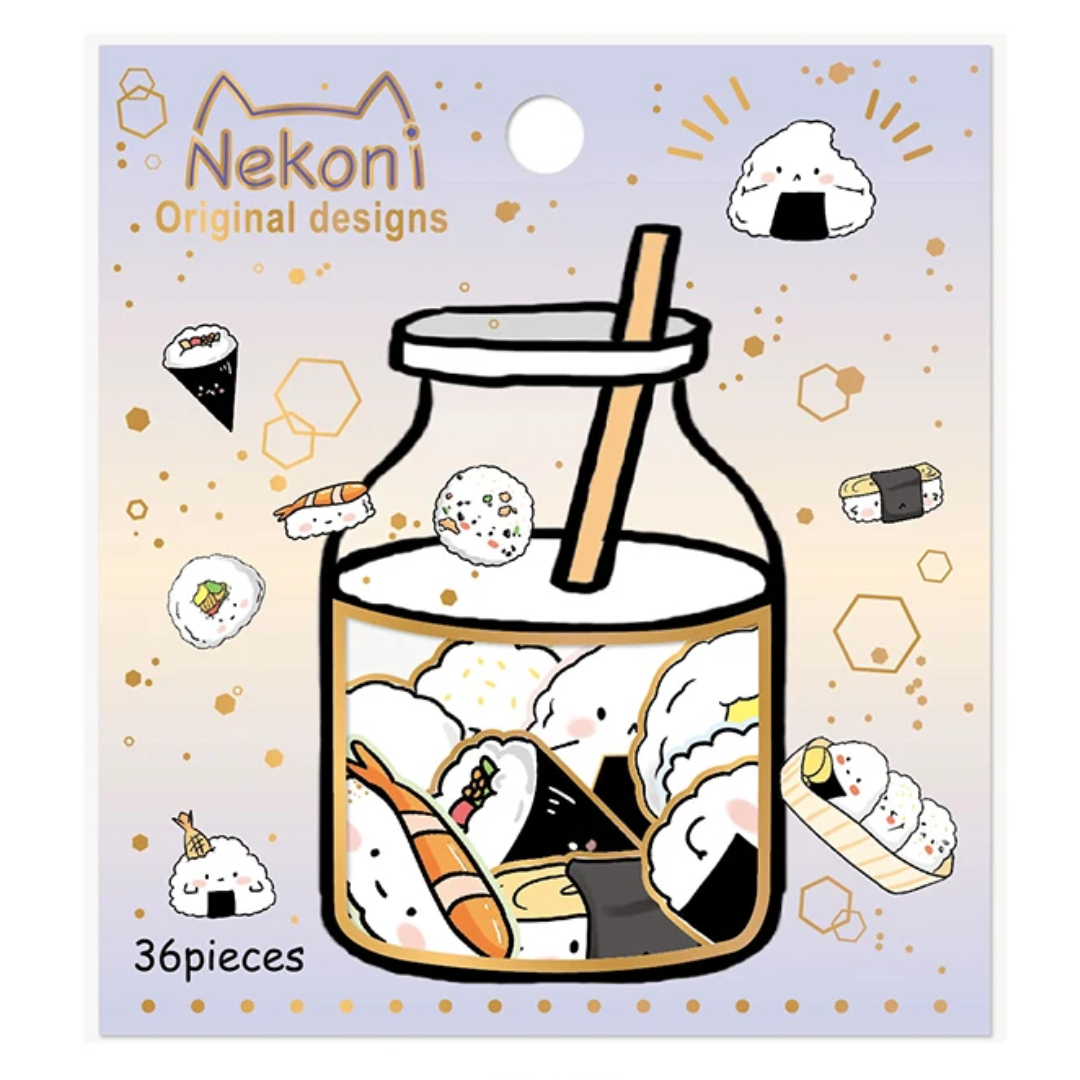- Pack Includes: 36 individual sticker flakes featuring sushi rolls, nigiri, and onigiri in a variety of cute expressions.