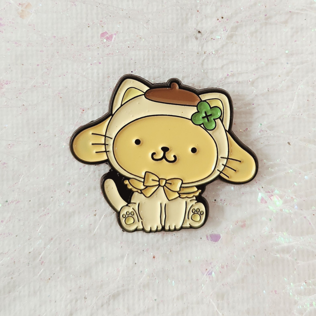 Two times the cuteness! This Pompompurin Cat Costume Enamel Pin features everyone’s favorite golden pudding pup dressed up as an adorable cat—complete with floppy ears, a bowtie, and a tiny green clover for extra charm. Whether you're a Sanrio fan or just a sucker for cute mashups, this pin is pure joy.