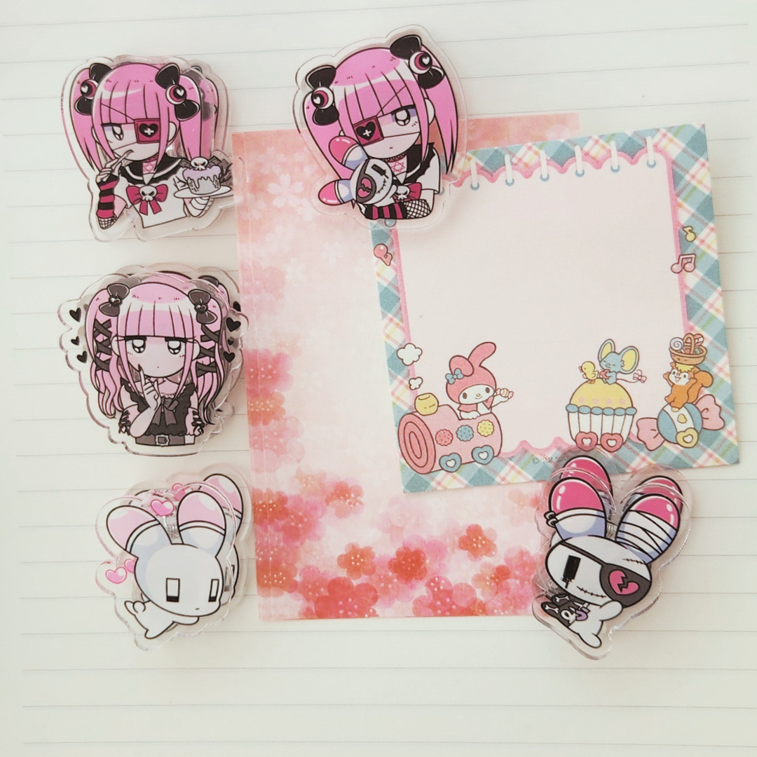 Set includes 5 acrylic clamps with gothic anime-style characters