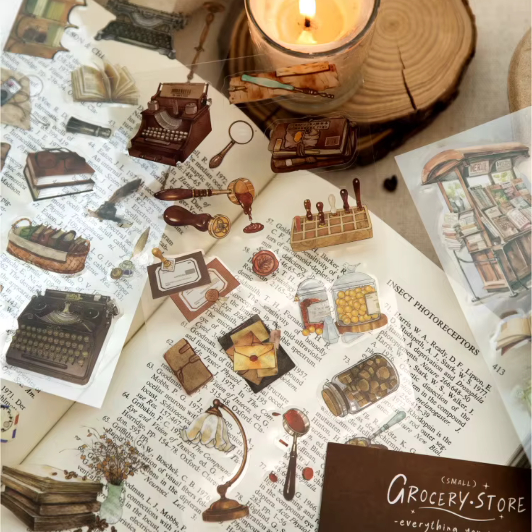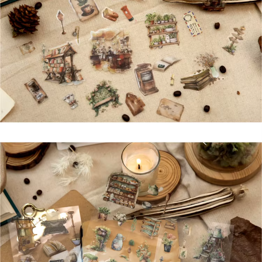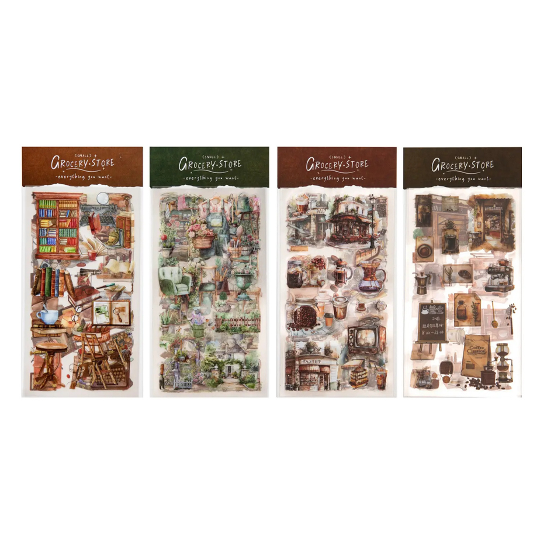 Transform your creative projects with this charming Vintage Grocery Store Sticker Set, featuring a beautifully illustrated collection of nostalgic scenes and objects. Each set includes four uniquely themed sheets that transport you to a cozy, rustic world filled with antique treasures, florals, coffee corners, and classic bookshops.