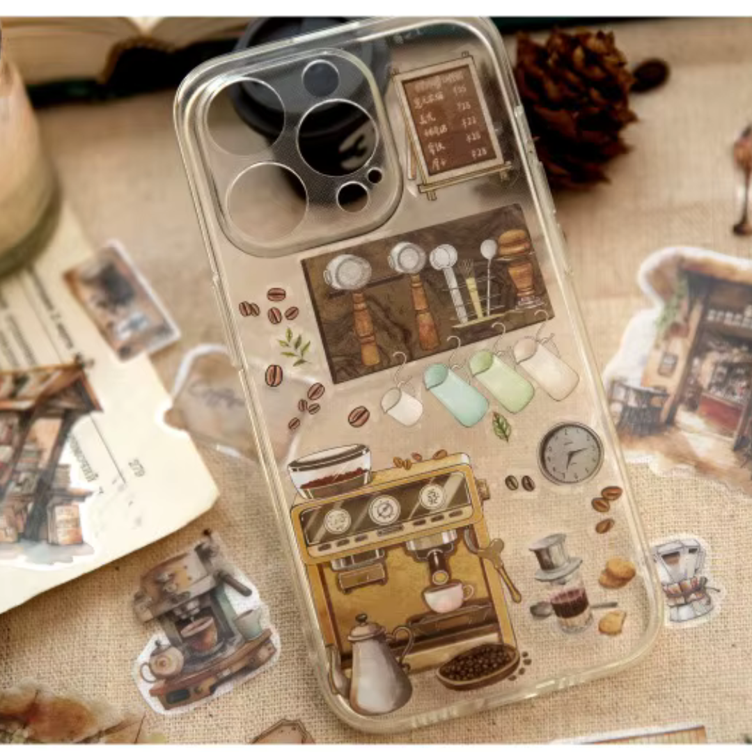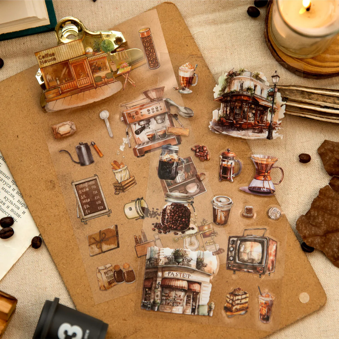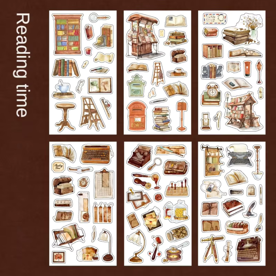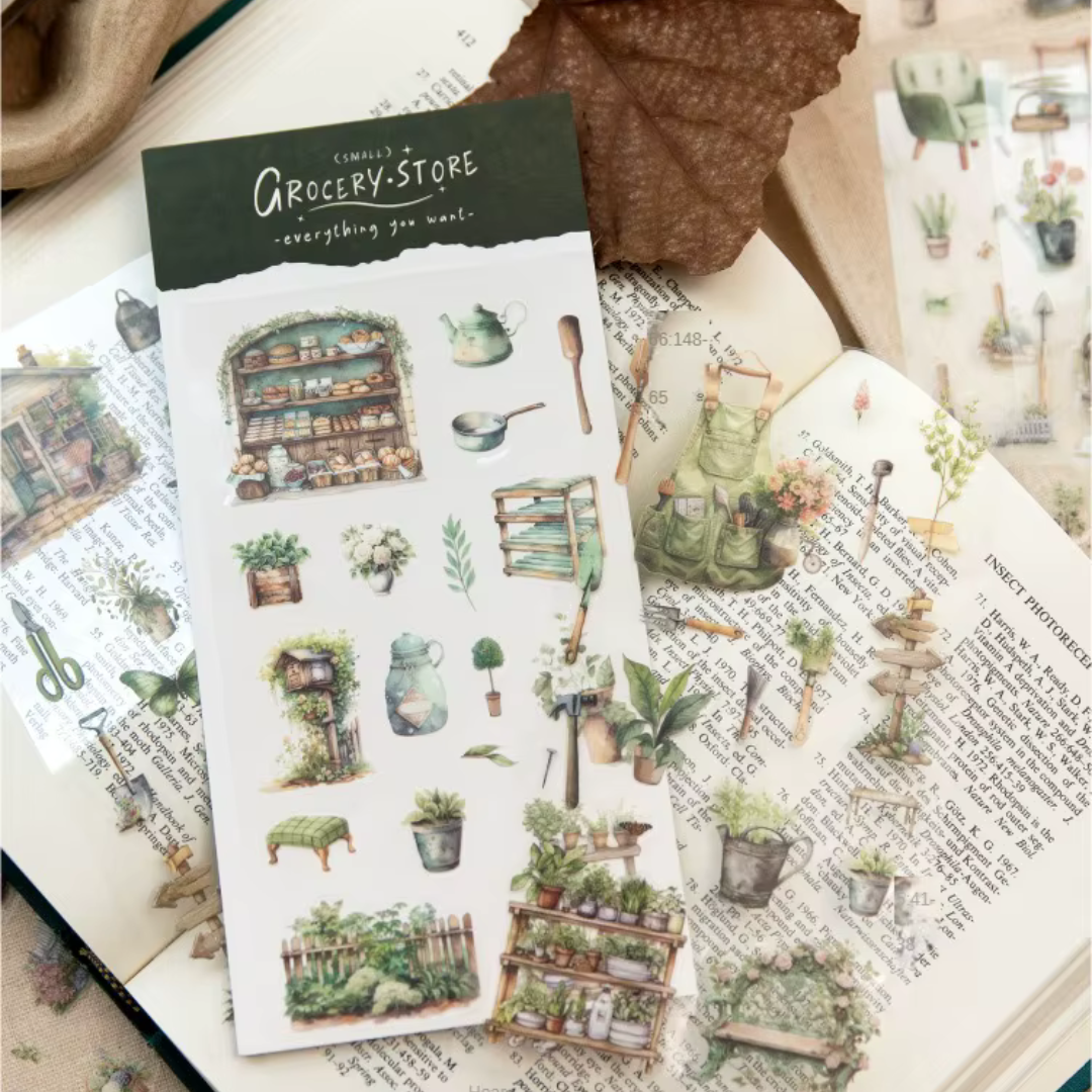 Transform your creative projects with this charming Vintage Grocery Store Sticker Set, featuring a beautifully illustrated collection of nostalgic scenes and objects. Each set includes four uniquely themed sheets that transport you to a cozy, rustic world filled with antique treasures, florals, coffee corners, and classic bookshops.